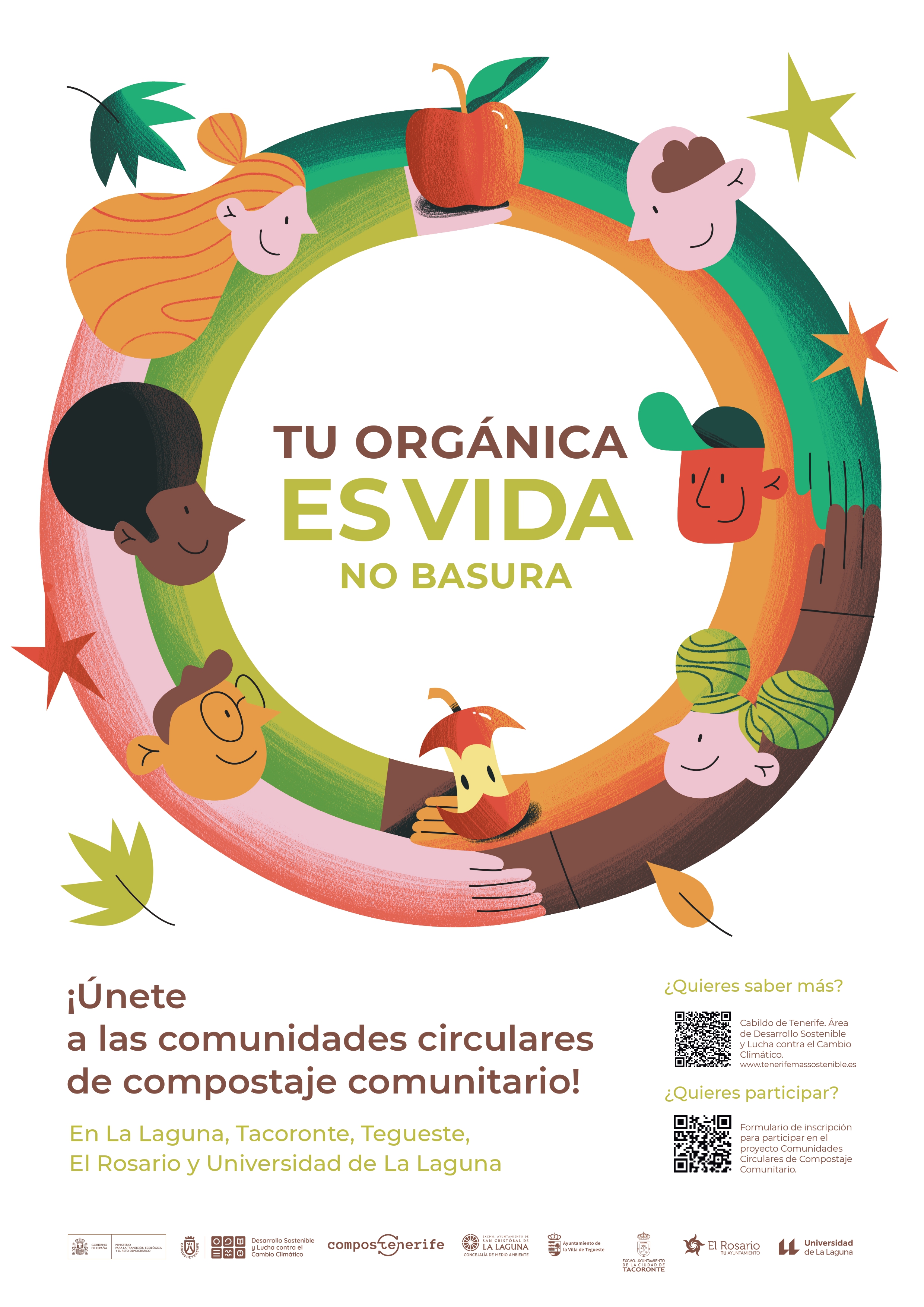 El proyecto “Comunidades Circulares de Compostaje Comunitario”, se lleva a cabo junto con los municipios de San Cristóbal de La Laguna, Tacoronte y Tegueste y bajo el asesoramiento del Cabildo de Tenerife y de la Universidad de La Laguna y está cofinanciado por el Ministerio para la Transición Ecológica y el Reto Demográfico.