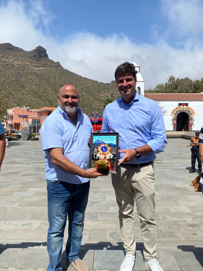 El primer edil Escolástico Gil, quien recibió un detalle institucional de manos de su homólogo en Santiago del Teide, Emilio Navarro, agradeció la colaboración prestada por el Consistorio santiaguero para facilitar el transporte de los 150 mayores y felicitó a la organización por la alta participación de una jornada especialmente dedicada a las personas mayores y que viene a cerrar la edición 2022 de las fiestas de La Esperanza.