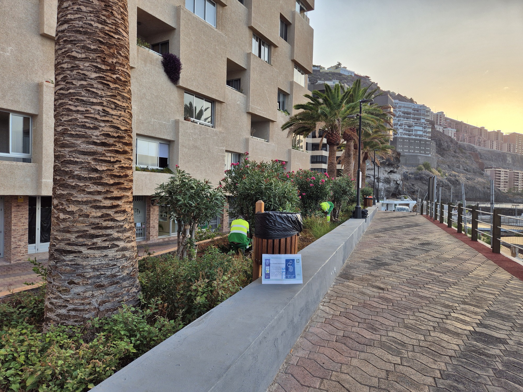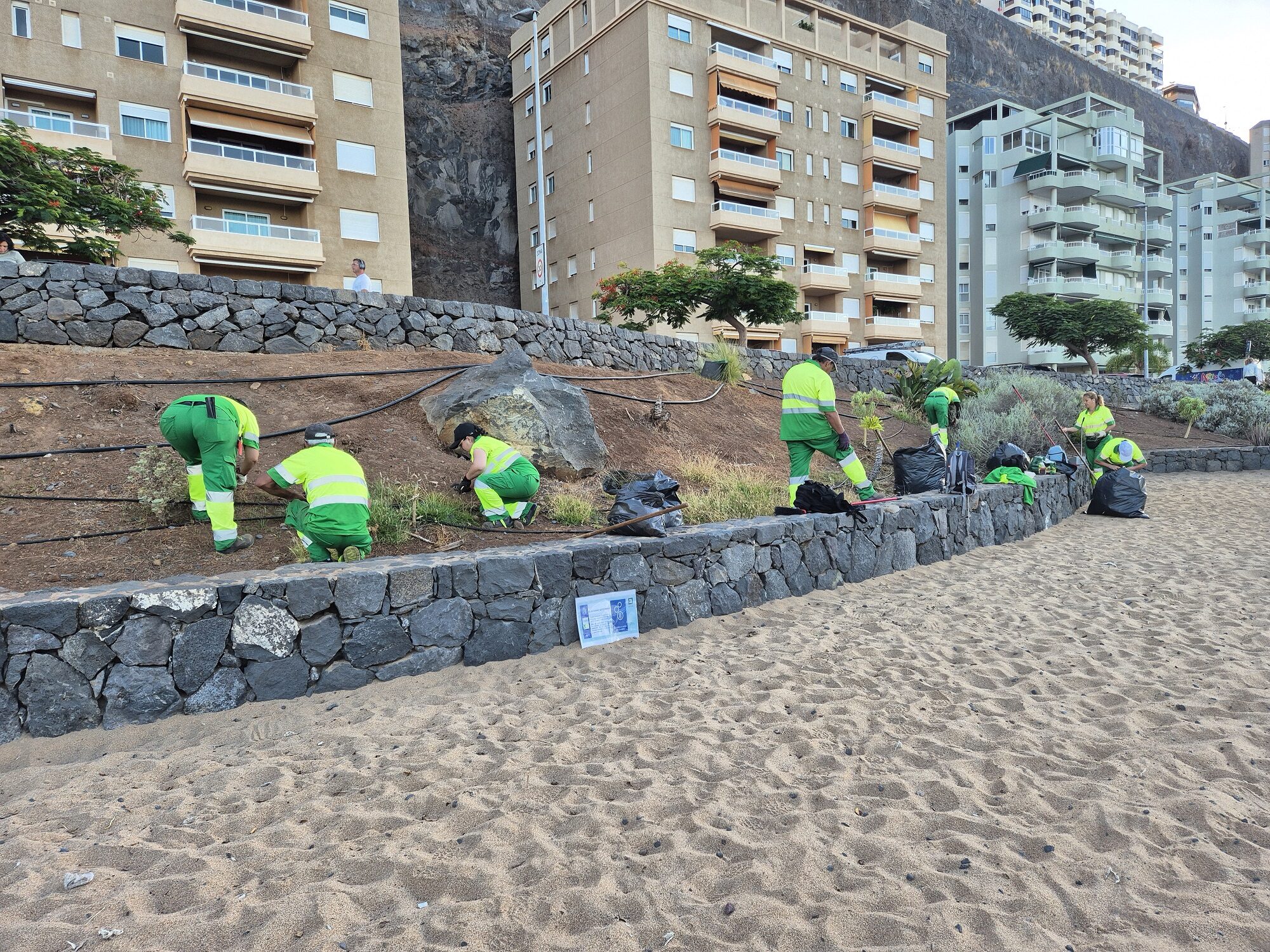 En Tabaiba Baja se realizó un repaso general y la poda de palmeras en vísperas de la inauguración del nuevo frente litoral y se completaron labores en la plaza Alexander Von Humboldt, en el parque infantil de El Chorrillo y en el parque de La Higuera, incluyendo poda, limpieza de jardineras y reorganización de material.