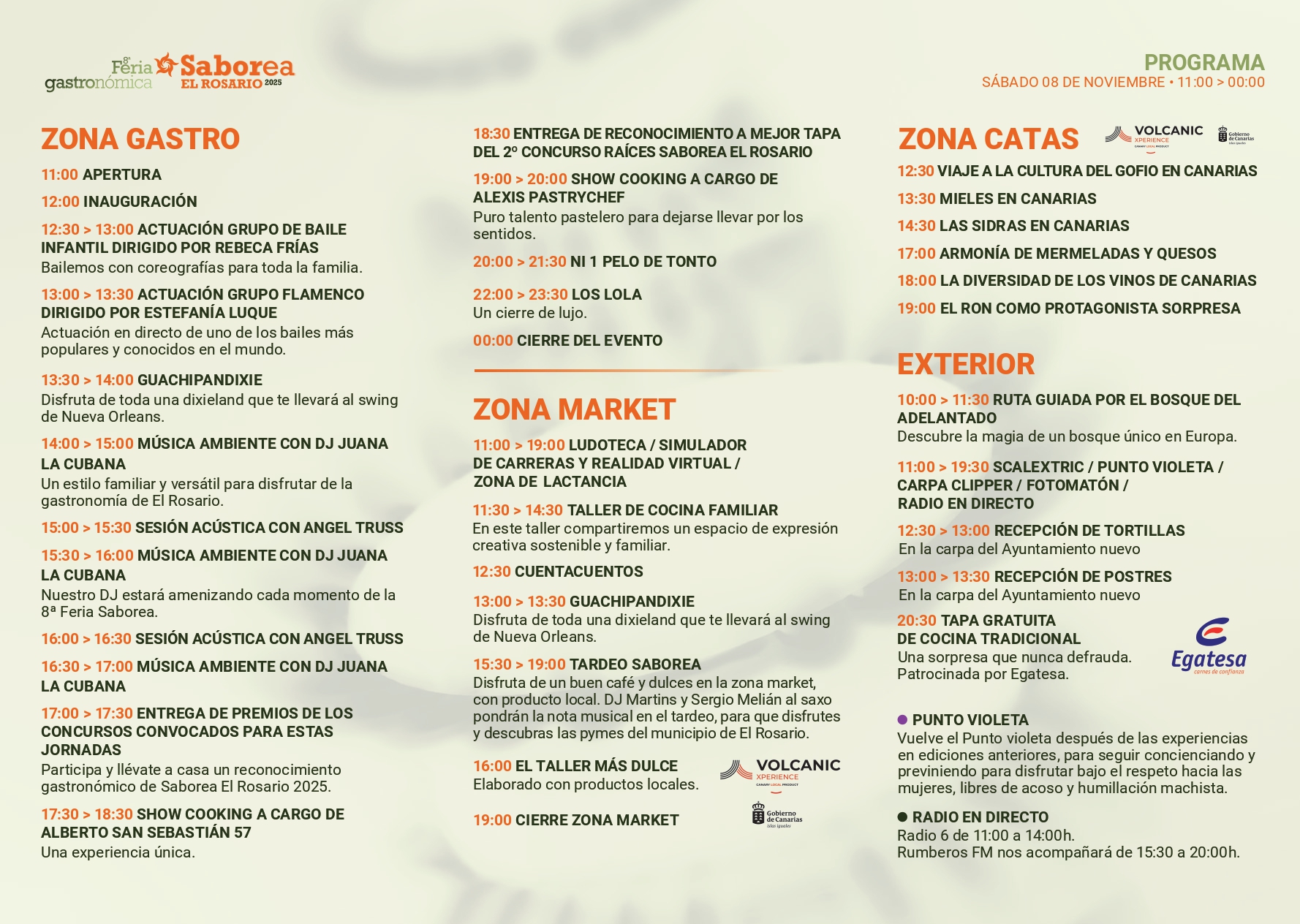 Las propuestas gastronómicas y la fiesta del agro local serán el trasfondo al que también se añadirán la séptima Jornada de Participación Ciudadana; los populares concursos de tortillas y postres; programas de radio comunitaria en directo, desde las 12:00 horas, a través de Radio 6 Tenerife y Rumberos FM; rutas guiadas por el bosque del Adelantado, a cargo del PFAE-GJ “Rosatur 2025”; y un Punto Violeta del área de Igualdad.