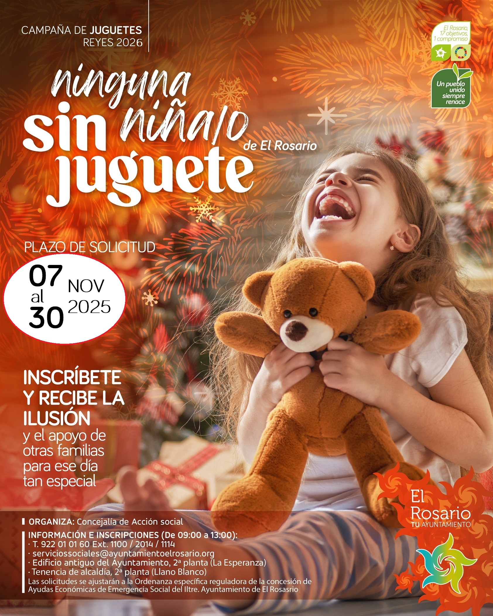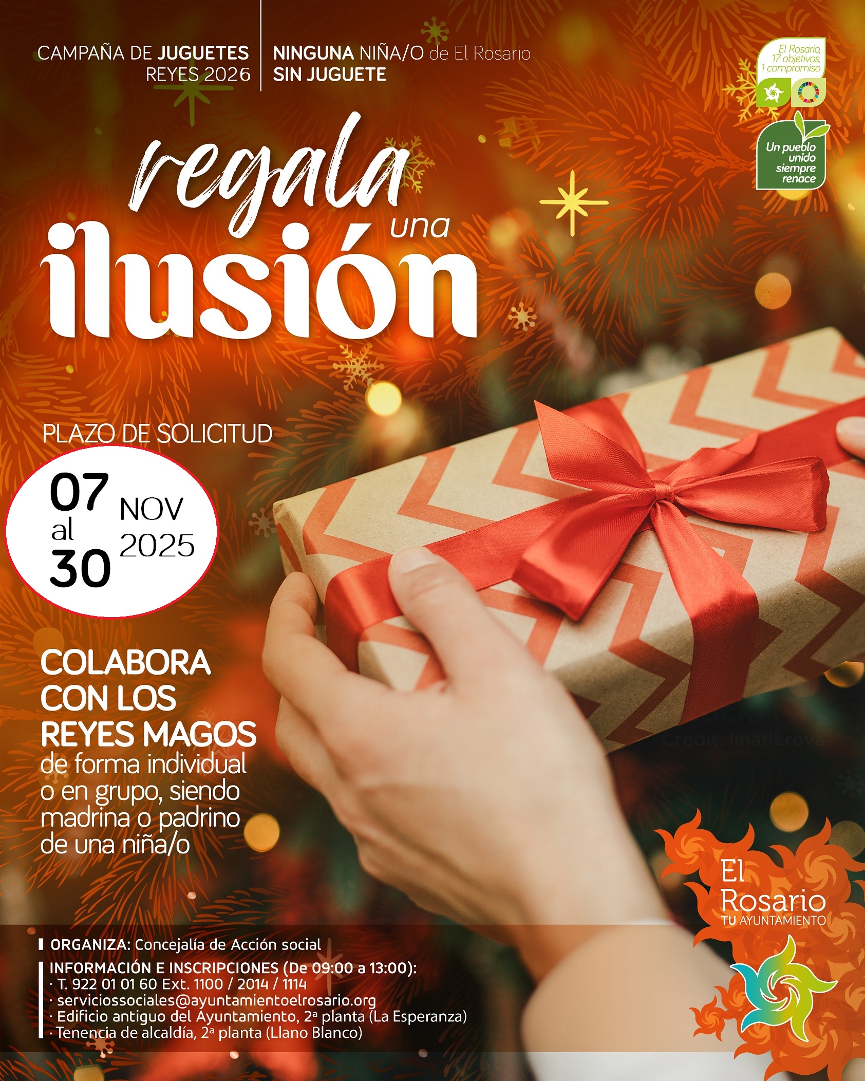 El Ayuntamiento de El Rosario impulsa, a través del área de Acción Social que dirige la edil Fátima Gutiérrez, la tradicional campaña solidaria "Regala una ilusión", a través de la cual familias, entidades y empresas ayudan cada año a que ningún niño o niña del Municipio se quede sin recibir regalos en la mágica noche de Reyes. Las personas interesadas en convertirse en madrina o padrino de uno de los menores inscritos en el programa tienen de plazo desde mañana, viernes 7 de noviembre, hasta el próximo día 30 para comunicarlo a la Concejalía. Posteriormente se les informará del sexo y edad del niño o niña que apadrinarán y de lo que ha pedido a los Reyes Magos en su carta.