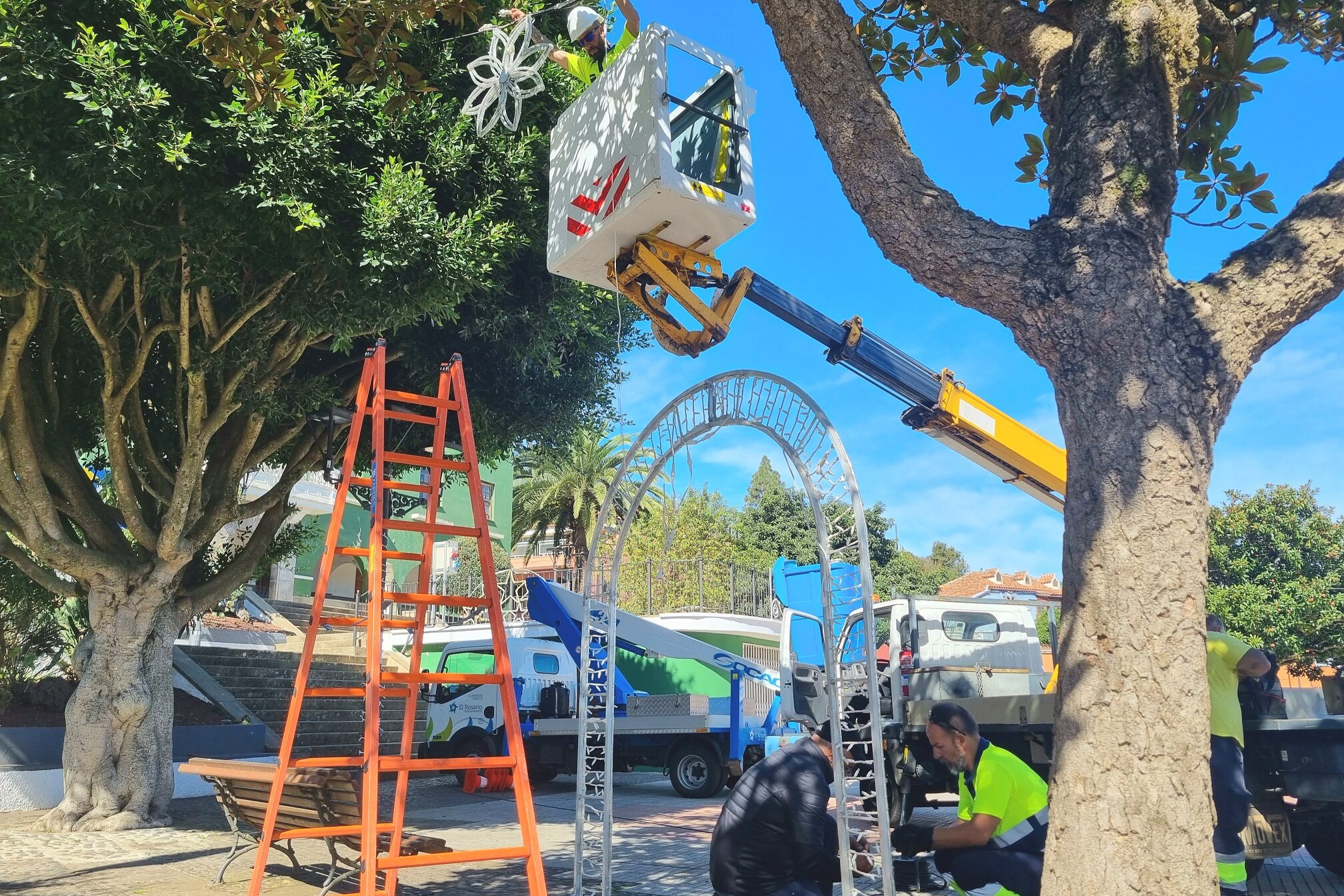 El edil de Fiestas y de Alumbrado Público agradece a los operarios el trabajo que están desarrollando desde hace ya varias semanas para instalar más de trescientos motivos luminosos en las principales plazas y calles de los distintos barrios de El Rosario. “Todo el mundo quiere tener una luz de Navidad en su calle y aunque es algo económicamente inviable porque nosotros no estamos en esa especie de carrera que a veces se ve por ahí de a ver quién gasta más, cada año intentamos incorporar algunos elementos novedosos, que este año serán esos photocalls en los que todos querremos sacarnos una foto para el recuerdo”, destaca Yeray Gutiérrez. De esta forma, todos los barrios contarán con adornos luminosos en sus principales calles, especialmente en las zonas comerciales, así como en los edificios municipales.
