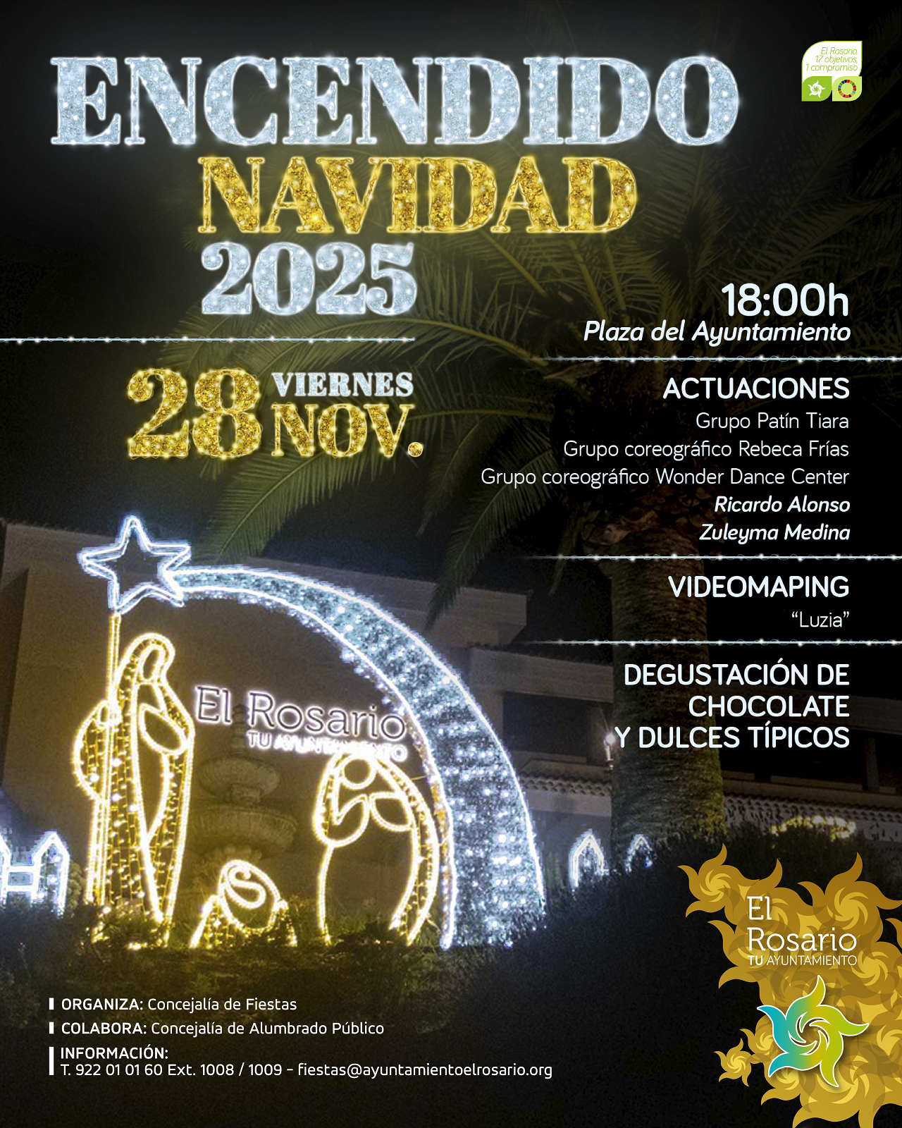 🎁🎄 Tradicional acto de encendido del alumbrado navideño. Será el próximo viernes 28 de noviembre en la plaza del Ayuntamiento. Desde las 18:00 horas se realizarán divertidas actuaciones y actividades de dinamización infantil. La velada culminará con el espectáculo de luz "Luzia" y las actuaciones de Zuleyma Medina y Ricardo Alonso. ACCESO GRATUITO.