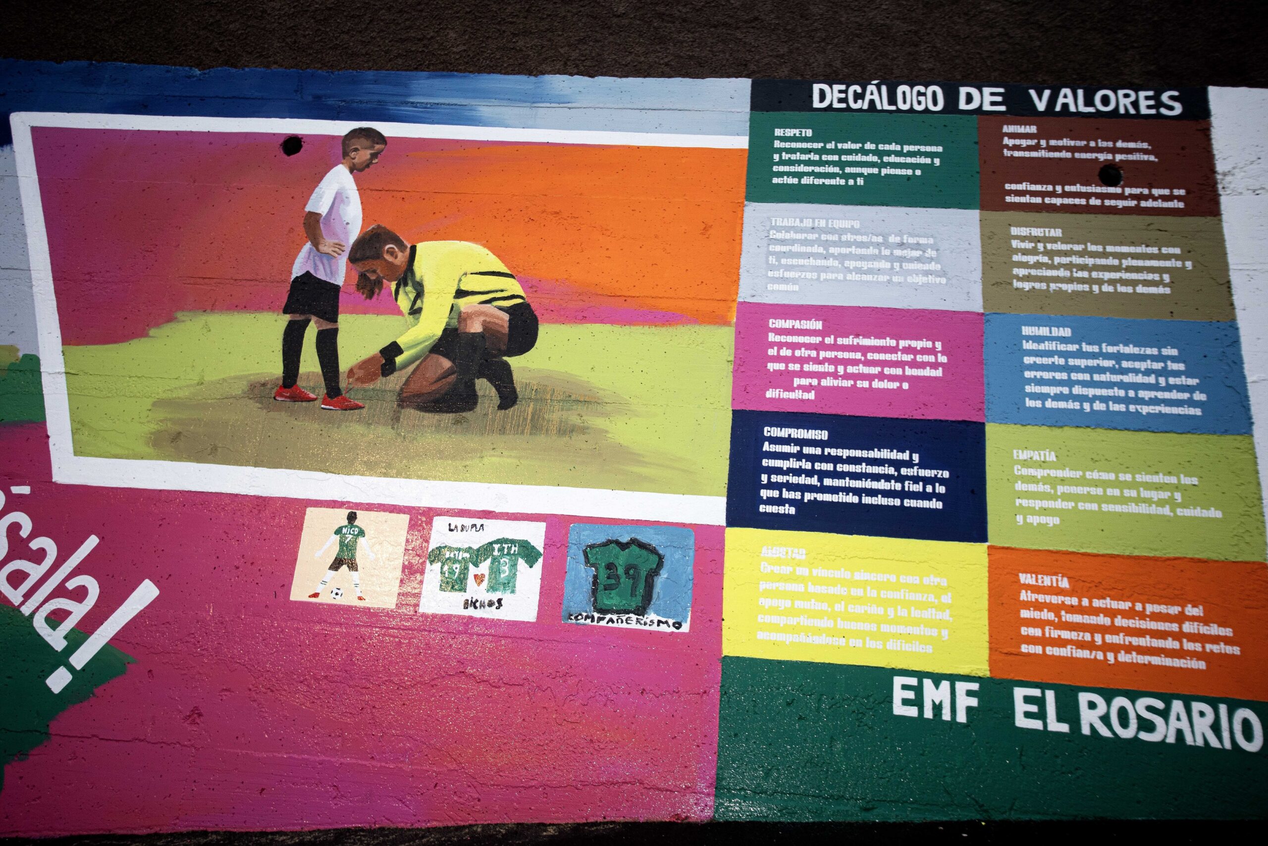 La obra, de carácter artístico y didáctico, pretende inspirar y sensibilizar a todas las personas vinculadas al deporte sobre la importancia de los valores que garantizan el bienestar, la educación y las conductas saludables, trasladando estos aprendizajes tanto al campo como a la grada y a la vida cotidiana. De esta forma, el fútbol base de El Rosario, en La Esperanza, da un paso firme hacia la mejora de la calidad deportiva y social con una decidida apuesta por el bienestar, la educación en valores y los comportamientos saludables dentro y fuera del terreno de juego.