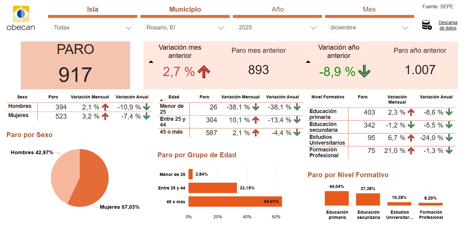 El municipio de El Rosario cerró el pasado año 2025 con 917 personas en paro y una tasa de desempleo del 10’08%. El Municipio lleva nueve meses consecutivos, desde el pasado mes de abril, por debajo de la barrera de las mil personas en situación de desempleo y vuelve a estar entre las localidades con menor tasa de paro de entre los municipios de Tenerife con una población de entre 10.000 y 40.000 habitantes.