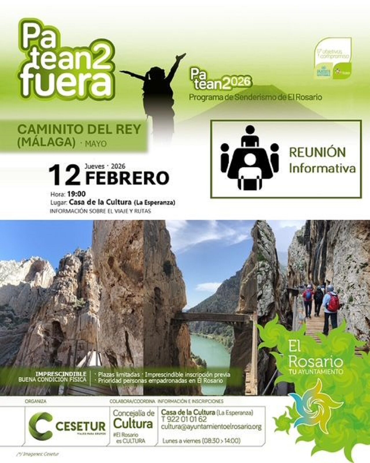 🗣️❓ REUNIÓN INFORMATIVA: El Programa de Senderismo "Patean2026" renueva su compromiso de contar con las rutas especiales de senderismo "Patean2 Fuera". En esta edición será la provincia de Málaga y su espectacular "Caminito del Rey", la protagonista del "pateo viajero", que se celebrará en el mes de mayo. La Casa de la Cultura "Carlos Alonso", en La Esperanza, acogerá un encuentro informativo el próximo jueves 12 de febrero, a las 19:00 horas, en el que se darán todos los detalles del viaje y se aclararán dudas.