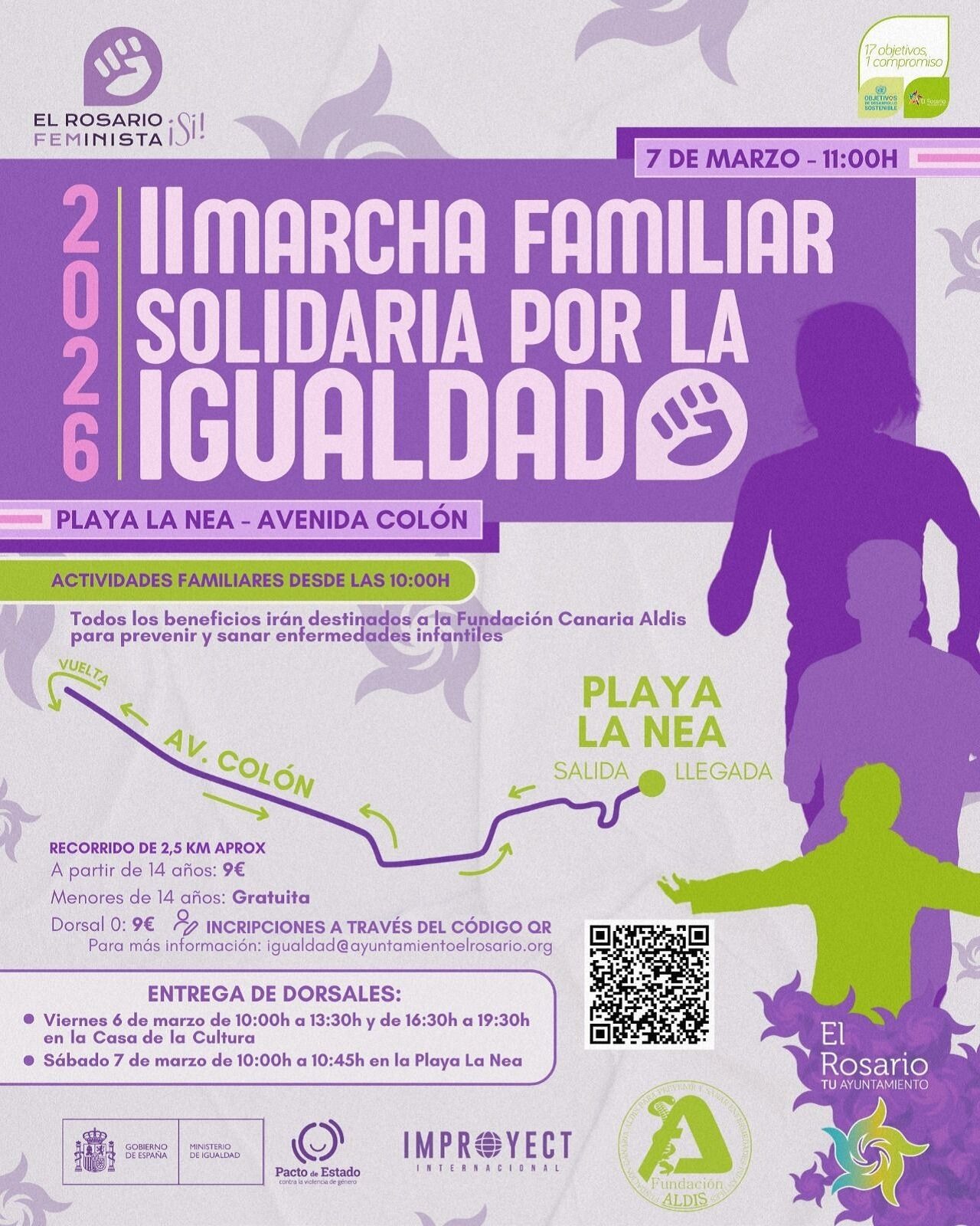 El Ayuntamiento de El Rosario reeditará su evento deportivo solidario con motivo del Día Internacional de la Mujer, que se conmemora cada 8 de marzo, y que en esta ocasión tendrá lugar un día antes, el sábado 7 de marzo con salida desde la playa La Nea, en Radazul, en formato marcha para facilitar la participación de las familias. La prueba, de carácter solidaria, está organizada por la Concejalía de Igualdad, con la colaboración de la empresa Improyect Internacional. La recaudación irá destinada íntegramente a la Fundación Canaria Aldis para Prevenir y Sanar Enfermedades Infantiles.