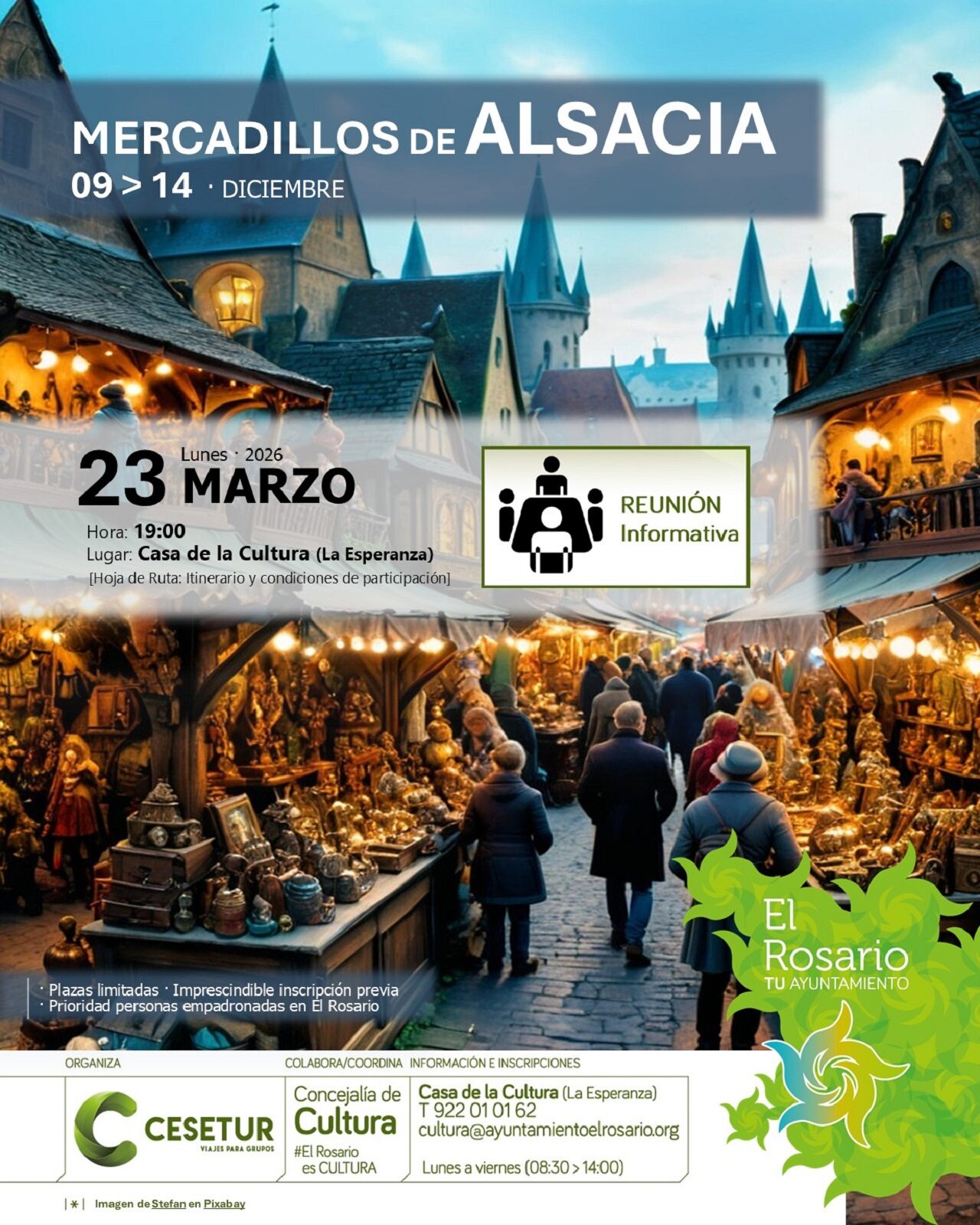 REUNIÓN INFORMATIVA: Si quieres disfrutar de la Navidad en la región francesa de Alsacia, no te pierdas la reunión informativa del próximo lunes 23 de marzo en la Casa de la Cultura "Carlos Alonso", en La Esperanza, a partir de las 19:00 horas. Daremos todos los detalles sobre el Viaje de Navidad, que organiza la Concejalía de Cultura El Rosario para este año 2026, y se aclararán dudas.